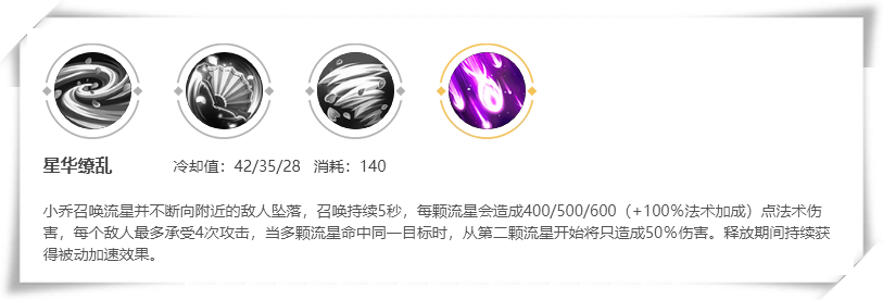 小乔召唤流星并不断向附近的敌人坠落,召唤持续5秒,每颗流星会造成400/500/600(+100%法术加成)点法术伤害,每个敌人最多承受4次攻击,当多颗流星命中同一目标时,从第二颗流星开始将只造成50%伤害。释放期间持续获得被动加速效果。