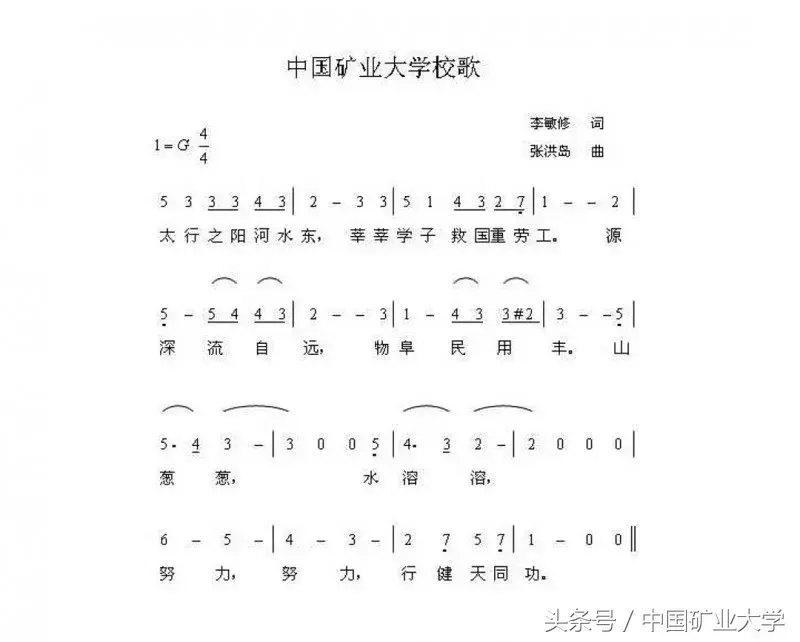 矿大校歌是由教育家李敏修作词,张洪岛谱曲,1934年撰写。被称为中国高校史上最简练,最深情的校歌。