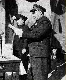 1951年1月,刘伯承院长在军事学院成立典礼上致词。左为中央军委代表陈毅。