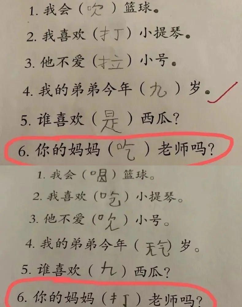 还有这些让人啼笑的练习题,“吹篮球”“打小提琴”“喝篮球”……不行了让我先去笑会。