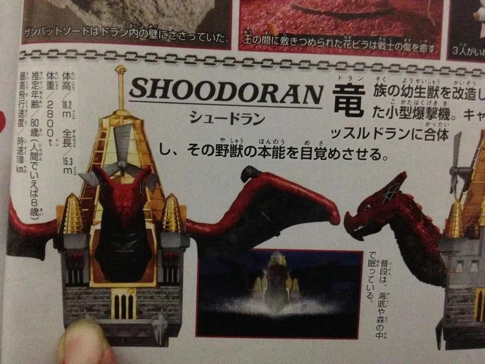 Shoodoran是由龙族幼生兽改造而成的小型爆击机,可以与德兰城堡合体,使其野兽本能觉醒,用于发射布隆导弹。通常情况下隐藏在海底或森林中。