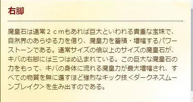 攻-通常踢力有比暗月破强的可能,配合wake up2更是让其具有轻松灭世的实力,如果再加上“完全的灭世兵器”无限制器Zanvat剑和最终必杀“能造成地球终焉的灾厄”德兰城堡的话,可谓是近乎无敌的输出了