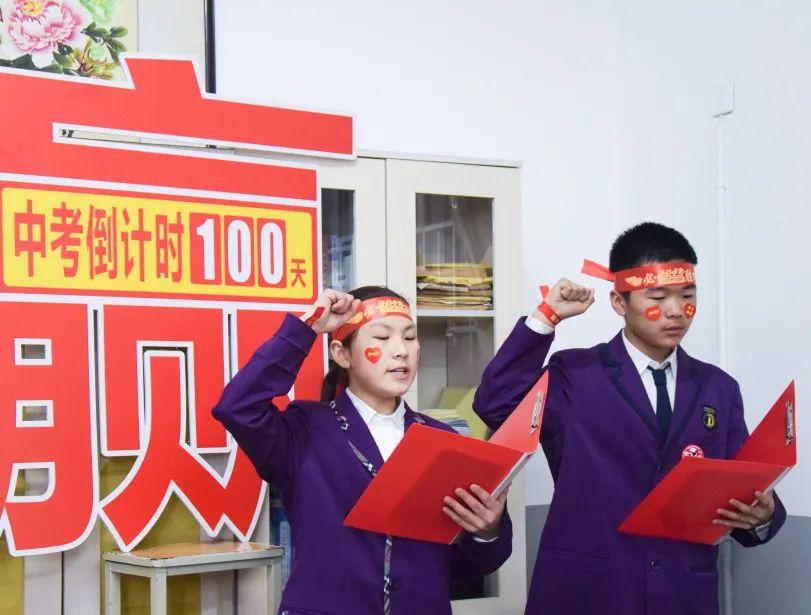 九(2)班王君玉、郭婕同学作为学生代表,向同学们发出号召:中考冲刺一百天,比的是知识,拼的是意志,赢的是心态!我们要坚定信心,奋力拼搏,科学备考,提质增效。师生凝心聚力,同向用力,创造属于每个人自己的青春回忆与光辉战绩。