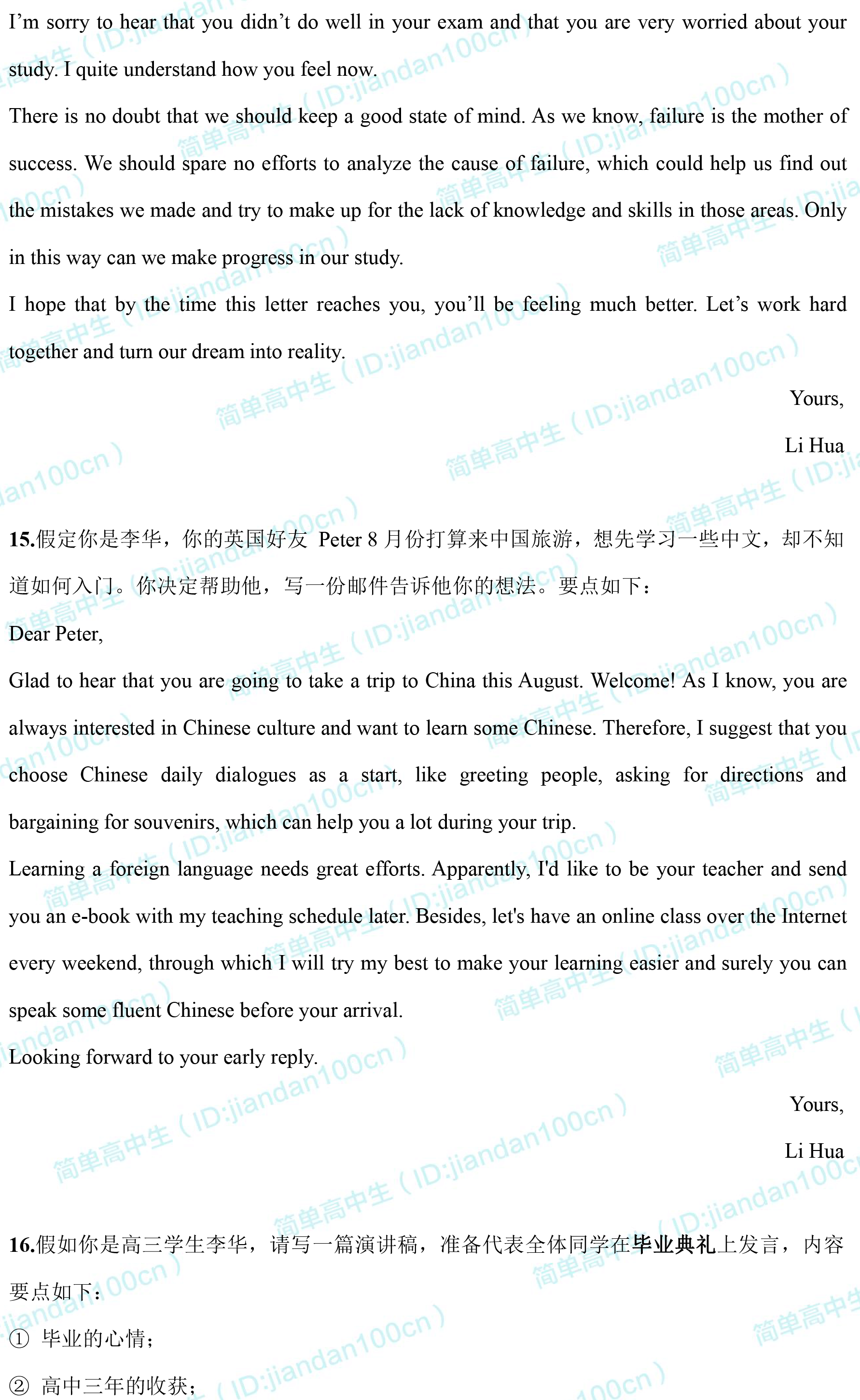 这25篇英语范文涵盖了高中英语常考作文类型,包括祝贺信、求职信、口头通知、演讲稿、投诉信、以及介绍中国传统文化的信件等。这些范文会为你的英语写作提供清晰的思路和丰富的素材,多看、多记、多思,相信在下一次的英语考场上,你一定能够写出更好的英语作文!