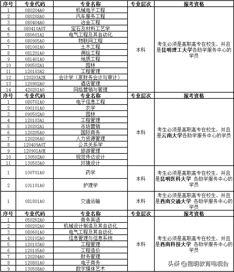 3.以下专业非在校考生不能报考。报考以下专业的考生,必须具备表内要求的报考资格,否则成绩将不予认可且不能取得毕业证书。