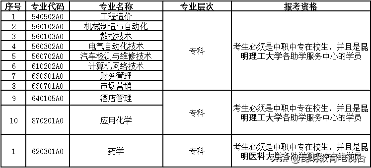 (二)面向高职高专和中职学校在校生开考专业:以下专业非在校考生不能报考,若错报,成绩将不予认可且不能取得毕业证书。