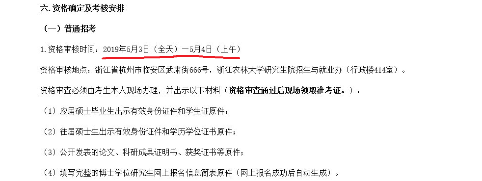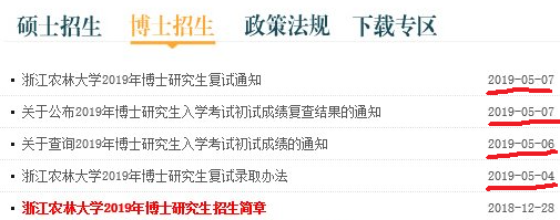 还有一个特别值得注意的是浙江农林的校训:求真 敬业。特别是敬业精神。2019年的浙江农林的博士招生考试过程中,5月1日劳动节(法定三天假日),5月3日现场资格审核,5月4日开始考试,5月6日就能查询考试成绩,5月7日出复试通知。各个院系的复试时间都是在5月7-8日。最让人惊讶的是有一半的专业是在16:00以后开始复试!甚至还有在18:30复试的专业!这样的效率和敬业精神不得不让人佩服!