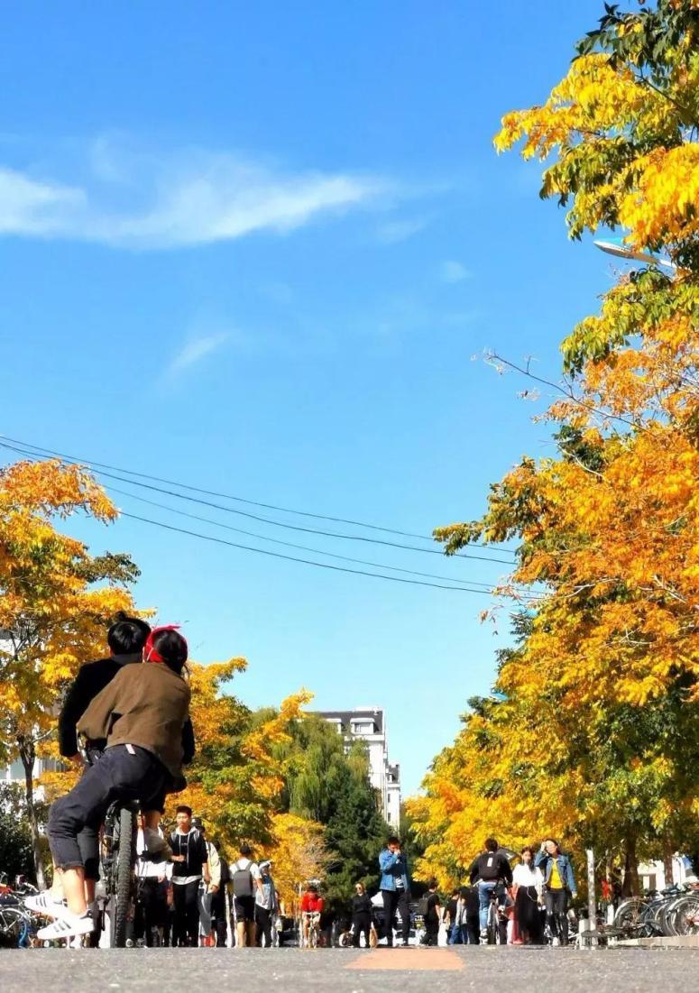 当树叶金黄,落叶归乡,吉大的秋天便来到了。秋风瑟瑟,落叶纷纷,清晨的空气中多了些许凉意。湛蓝的天空和金黄的秋叶为熟悉的建筑添上一层不同的色彩,骑单车慢行于校园,看树叶打着旋儿飘落,心中便豁然开朗。
