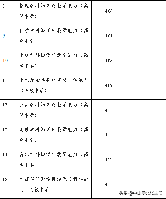 4. 高级中学《学科知识与教学能力》科目为:语文、数学、物理、化学、生物、历史、地理、思想品德(政治)、英语、音乐、美术、体育与健康、信息技术、通用技术等14个学科。