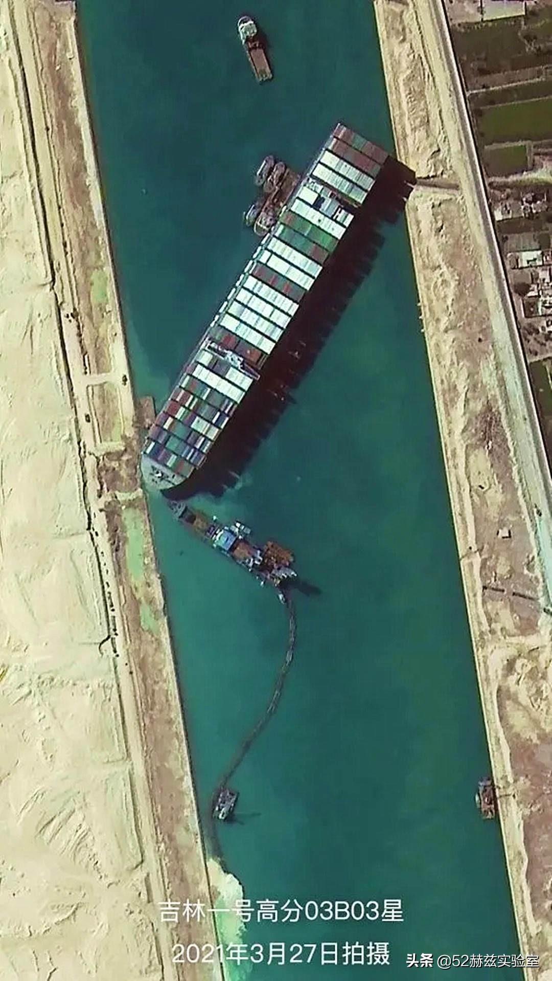 比如在2021年的3月份,目标苏伊士运河,"长赐号"超大集装箱货轮搁浅,"吉林一号"就静静地看着它,为我们带来独特的空中视角。