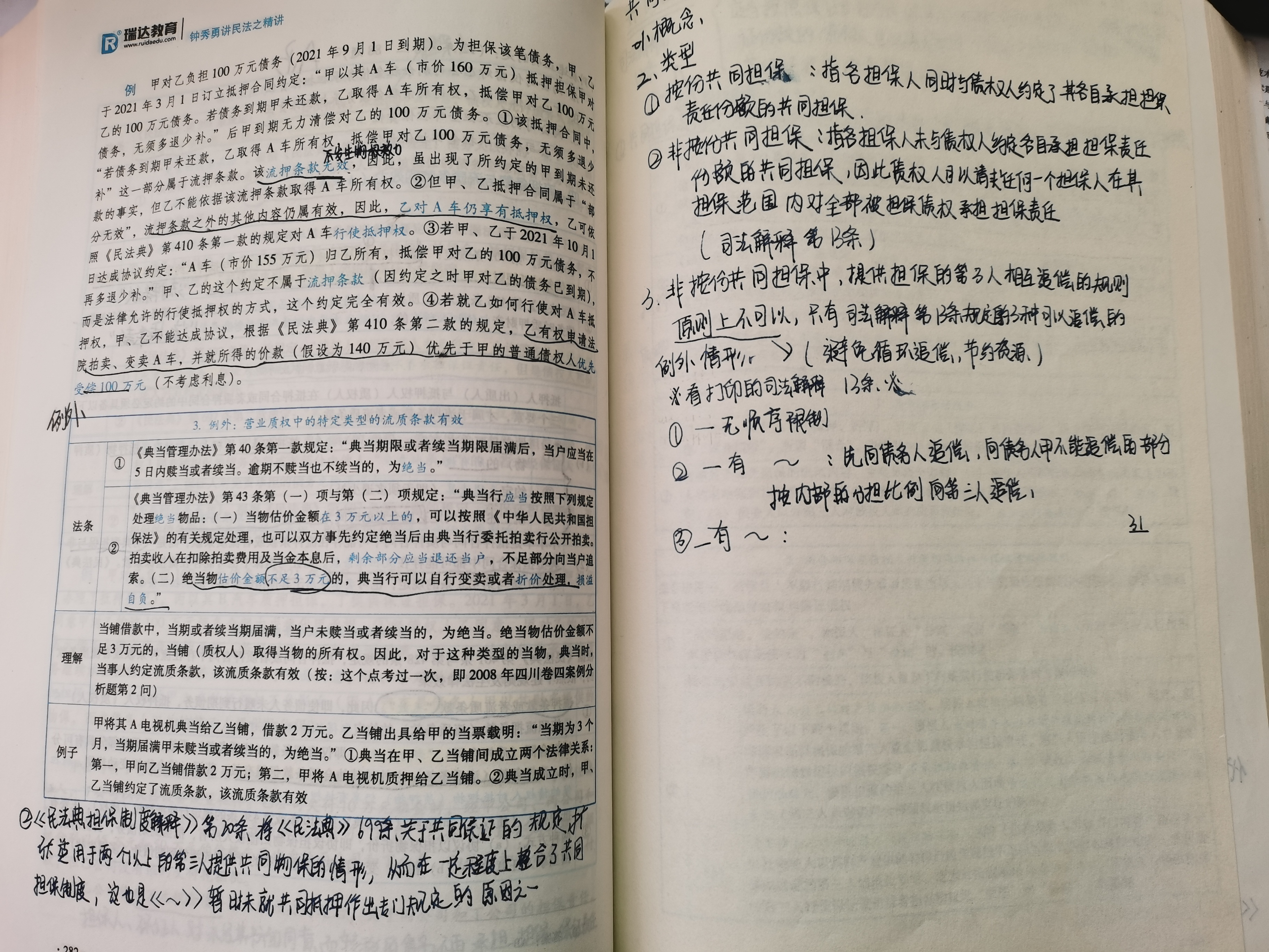 2.用当年新出版的书,不然听视频课的时候会超级痛苦。很多变更或者新增的知识点,你都不知道讲到哪里,云里雾里的。以民法为例,与2020年相比,2021年《民法典担保制度解释》发生变更,这一部分是重点,所以书本内容发生了重大变更,自己手写太慢了。而且会影响听课效率。