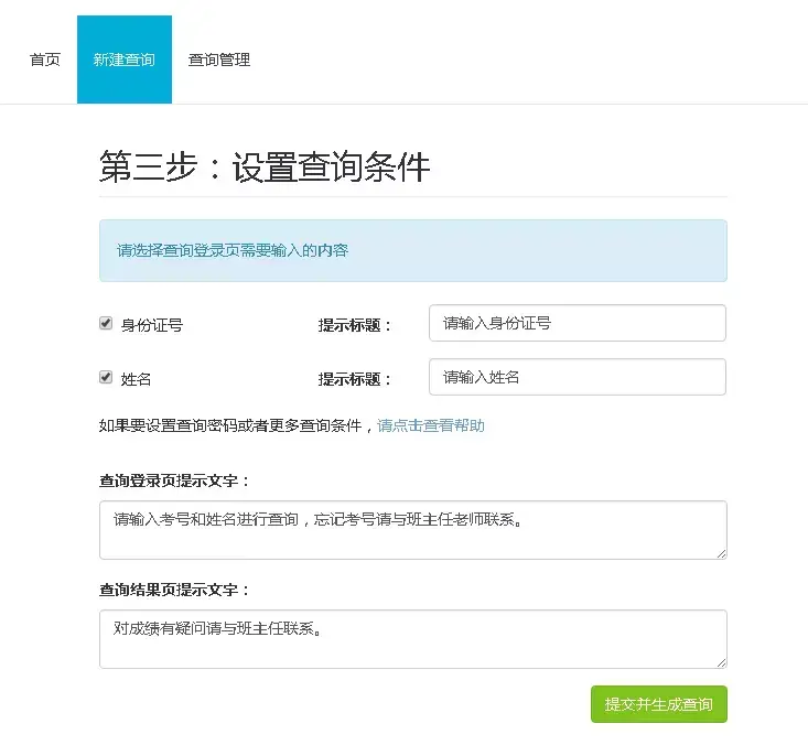 可以在查询登录页提示文字里输入给所有学生的提示,比如怎么输入查询条件。