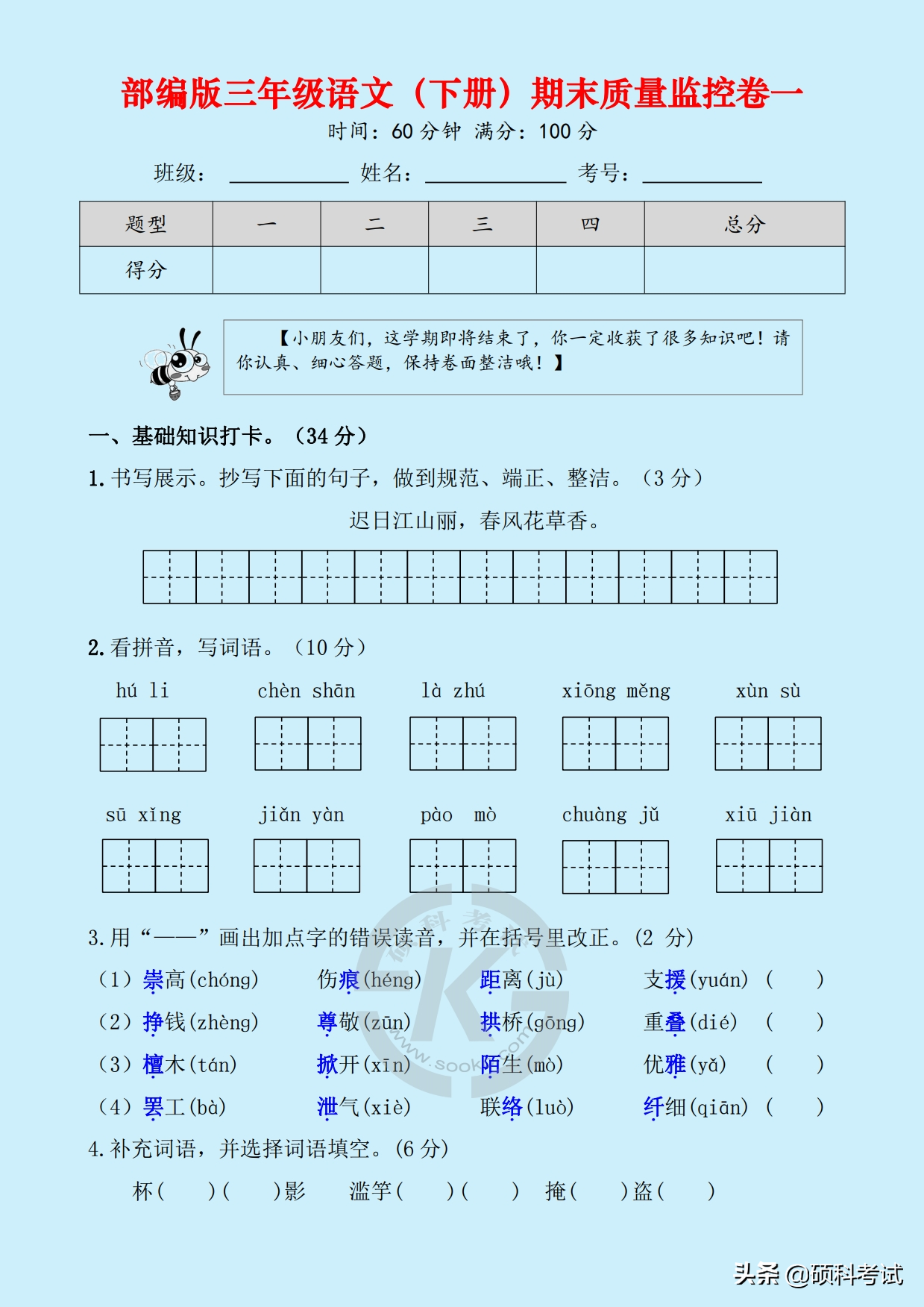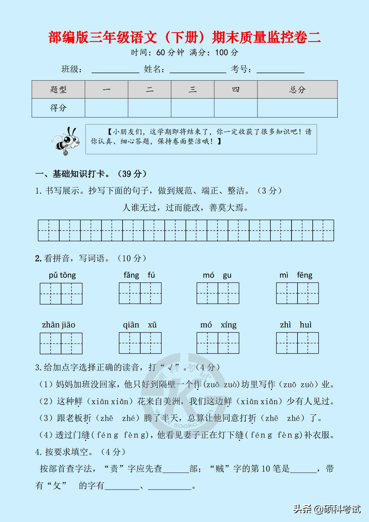 部编版三年级语文(下册)期末质量检测卷,主要考查:看拼音,写词语、加点字的错误读音、补充词语,并选择词语填空、查字典,完成练习、句子练习、根据原文填空、阅读、习作等知识点,适合三年级学生巩固语文知识,冲刺提分,建议家长给孩子练练!
