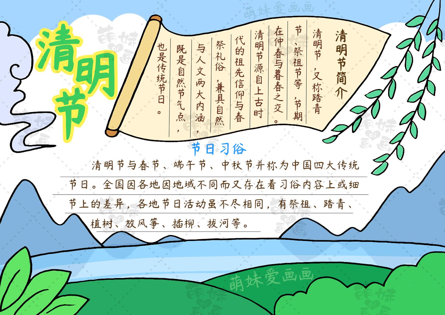 清明节与春节、端午节、中秋节并称为中国四大传统节日。今天萌妹老师给大家带来一组含文字内容的清明节手抄报,简单又漂亮,手抄报作业不用愁。