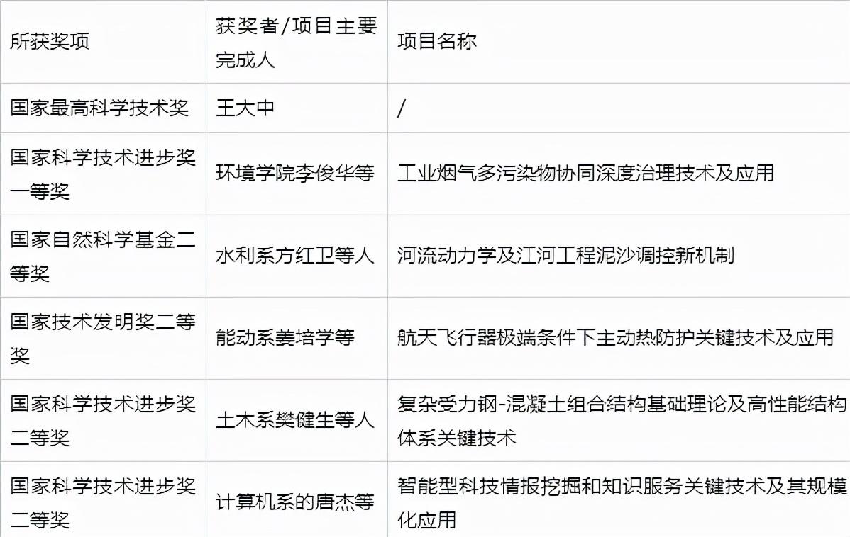 在国家三大奖方面,今年清华大学也同样获得了骄人的战果——作为第一完成单位或第一完成人所在单位获国家科技三大奖6项,获奖项目数位列全国第四。其中一等奖2项,二等奖4项。另外,清华大学参与完成的获得三大奖的项目数高达15项,参与完成数位列全国高校第一位。