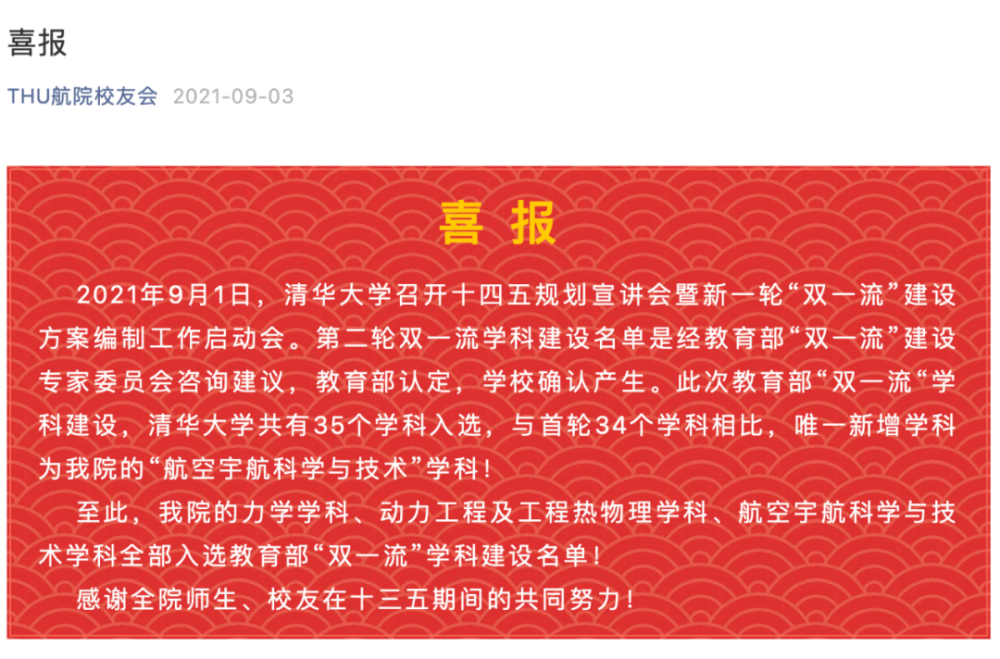 除此之外,清华大学的校友也高调宣布了其航空宇航科学与技术入选第二轮双一流学科,成为了我国高校中为数不多在航空航天方面晋级双一流学科的高校之一,而就目前而言,航空航天强校有的还没有此类学科入选双一流学科建设,由此可见这个在清华大学成立不到20年的学科的强势。