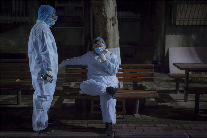 这个晚上,我们第二次到了中南街道的这个小区里。这次,除了疾控中心的两位工作人员和陆海月,其余没有任何人上楼去。我站在离楼道口四五米远的地方观望,看到他们两人穿的防护用品呈橡胶质感,更笨拙,也更密闭。10分钟后,消毒人员下楼,迫不及待地要脱掉全身的装备,他们的表情,看上去非常难受。另一位他们的同事拎着一根管子走过去,转过身我才看见,一个大号喷壶背在身上,跟洒农药的家伙什儿很像。脱衣服之前,洒一遍,脱掉后,又洒一遍。我跟陆海月说:“你也过去,叫他给洒洒。”