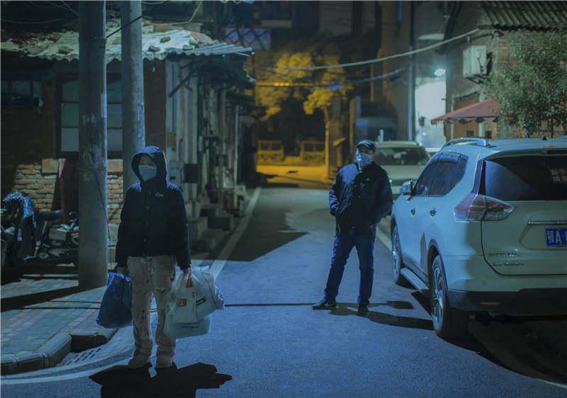 夜色厚重,小区里路灯同样暗淡。一团人围在社区服务中心门前,有穿保安制服者,也有像我们这样全副武装者,另外还有两辆派出所的SUV停在社区门口。几分钟后这两辆车先走一步,车道狭窄,调头时颇为费力,在场的人目光大都被它们吸引,目送其离开。其中一辆车的车窗缓缓落下,一个声音对着郑冲的方向说“那辛苦你们了”,郑冲圆滑应对,“应该的应该的”。人群外围,有一年轻姑娘,穿着粉色摇粒绒睡裤,黑色羽绒外套,脸上简单戴一口罩,面目看不大清楚,但眼睛里透着一股力量。见我同她谈话,立刻往右移动两步,“最好离我远一点”,“我虽然没做过检查,但我肯定是感染的了”。隔着大约三米,我们谈了几句。我没敢多问,她声音里明显带哭腔,刚刚去世的,正是她奶奶。