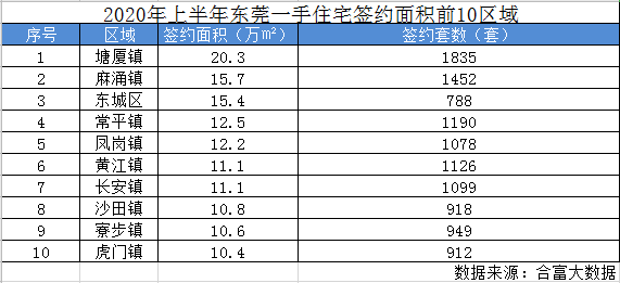 2020年上半年 东莞一手住宅签约面积前10区域图▲