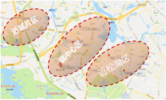 我们根据寮步地形把房地产新房供应市场分为3个片区:近城片区、镇中心片区、近松湖区。