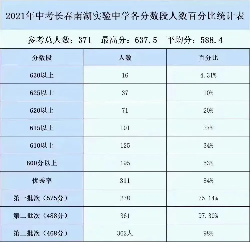 长春市中考前三名,都来自师大明珠分别是640分、639分、638.5分。今年师大明珠毕业生1261人,高分段比例中,630分及以上45人,占总人数的3.6%;620分及以上222人,占总人数的17.6%;610分及以上447人,占总人数的35.5%;600分及以上611人,占总人数的近50%。