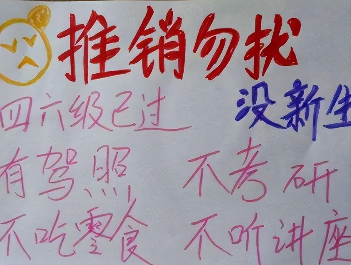 刚上大一的时候,很多学生都不知道要在寝室门口贴上标语,所以经常会有一些推销人员进来,而同学们还得碍于面子不好拒绝别人。