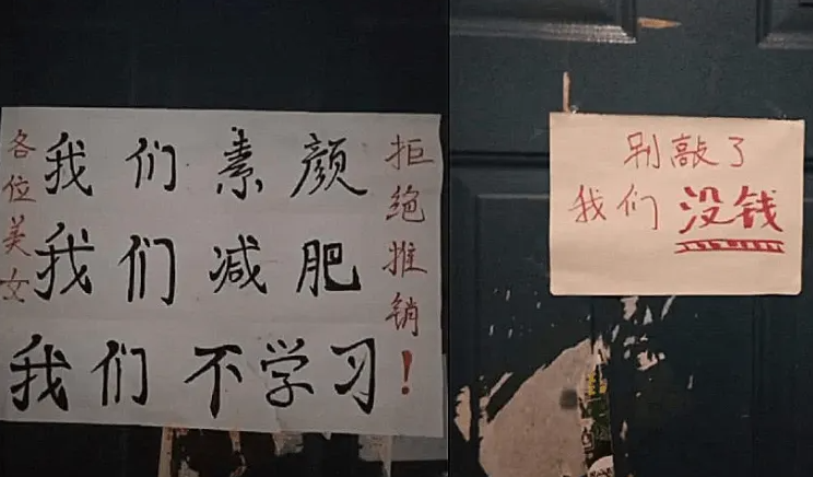 而且还有一点,就是大学生通常会在宿舍门口贴上标语,为了防止有些推销上门宣传,影响寝室人休息等等,而这些千奇百怪的宿舍门口标语也随之火了起来。
