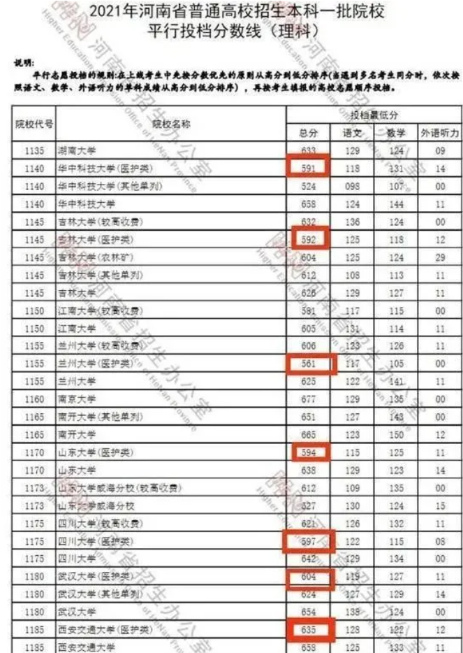 像“华中科技大学医护类”,实力非常不错,每年医学类专业录取分数线几乎都在650分左右,而今年直接降到了591分,降低了50多分。