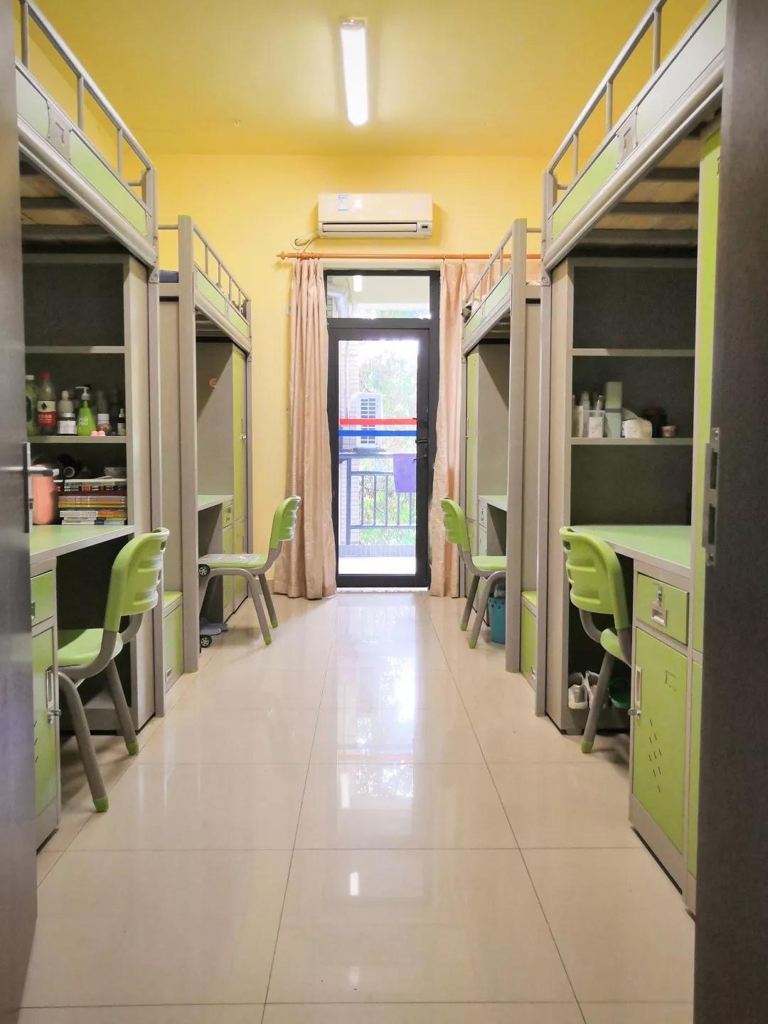 宿舍为标准四人间,阳台、独立卫浴、空调、饮水机、热水器一应俱全。每栋宿舍楼都有活动室,可以学习或者举行小型活动,一楼还配有洗衣房,可以自助洗衣。