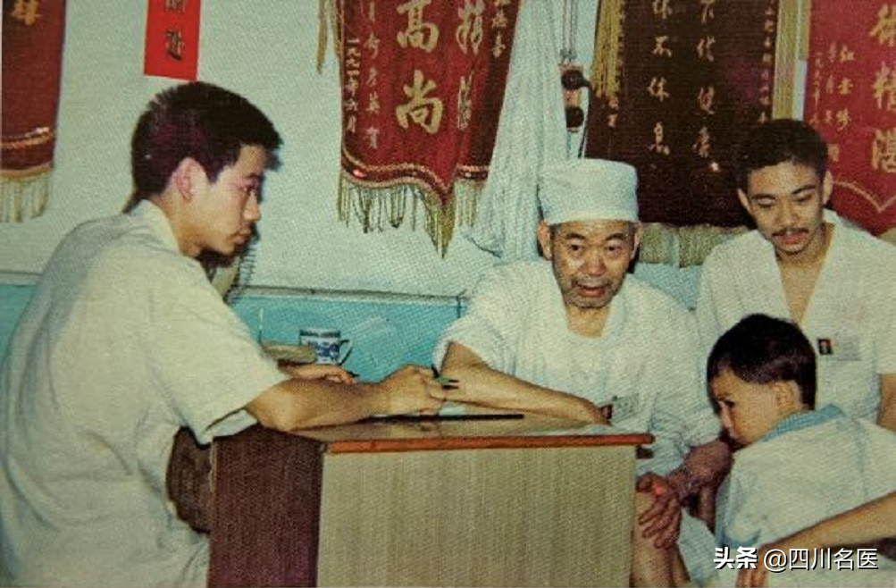 (90年代萧正安教授门诊工作照,左右为萧正安两子)