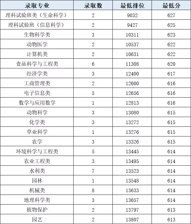 中国农业大学招生专业主要以农学为主,兼招部分计算机、电子和经管类专业。2020年录取分数最高的5个专业分别是理科试验班(生命科学)、理科试验班(信息科学)、生物科学类、动物医学和计算机类。