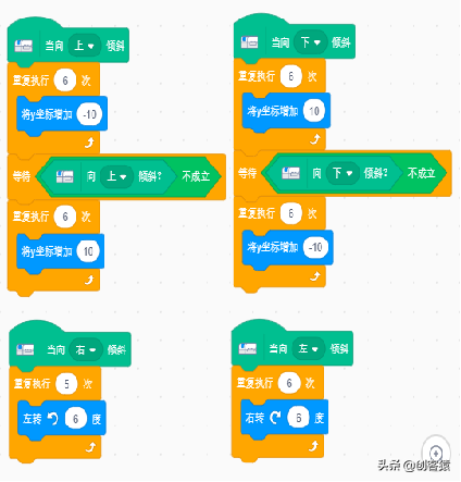 新建的环境角色,要初始化起始位置X:0,Y:0,大小变成200,方向面向90°(新建角色默认面向90°),不断循环切换造型(需要加个0.05S延迟)因为是相对运动,所以想让飞机产生往左飞的效果就需要按右键,让飞机产生往右飞的效果就需要按左键,让飞机产生往上飞的效果就需要按下键,让飞机产生往下飞的效果就需要按上键。往上飞时,按住上键不能让环境角色一直往下移(一直移就没有动态效果了),只需移动一定的距离,当松开上键,环境角色位置就复位,这样就产生了控制杆不拉升时,飞机就平飞的感觉。扩展:用Wedo倾斜传感器当作控制器,遥控飞机飞行方向。