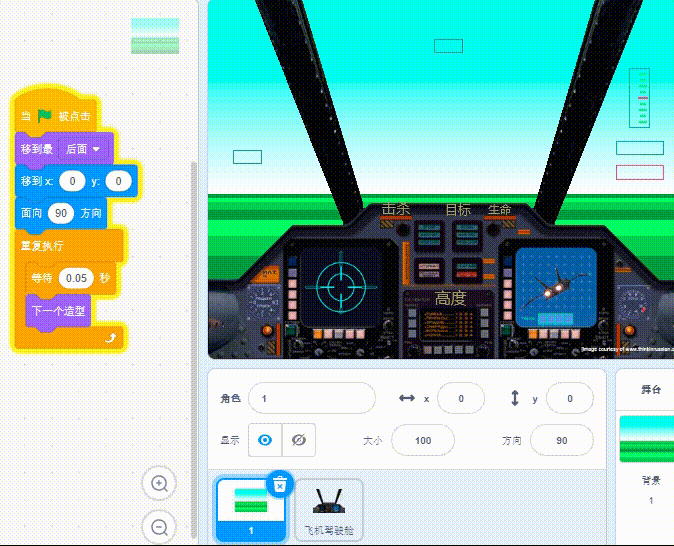 第一步:添加背景,创建驾驶舱角色,给飞机加声音。