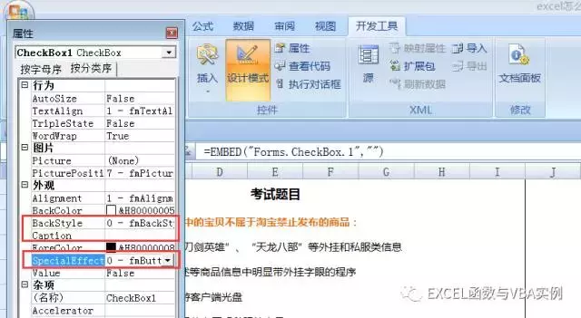 第三步:调整复选框图标格式。选择单选框图标,点击右键-“属性"进入设置。如下图:将BackStyle格式设置为0,将Caption格式设置为空,将SpecialEffect设置为0。