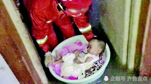 10日早上6点15分左右,聊城高唐县的消防员赶到福源路一处在大暴雨中被淹的平房里,水深淹到了床铺,一名1岁左右的幼童仍然在安静地入睡,消防员找到一个塑料大盆子,孩子家人将小毯子铺到里面,把孩子轻轻抱在上面,消防员小心翼翼地扶着盆子,在深水中缓缓行走。