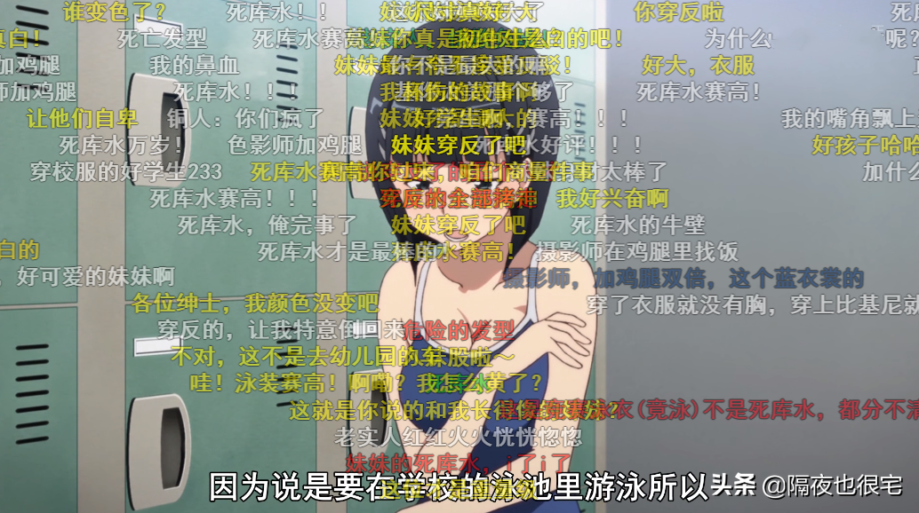 而《刀剑神域》的OVA也安排了一场泳装盛宴,其中的桐谷直叶就穿上了死库水。而从弹幕的反馈上看,死库水对阿宅们的杀伤力,比其他角色的比基尼更强;