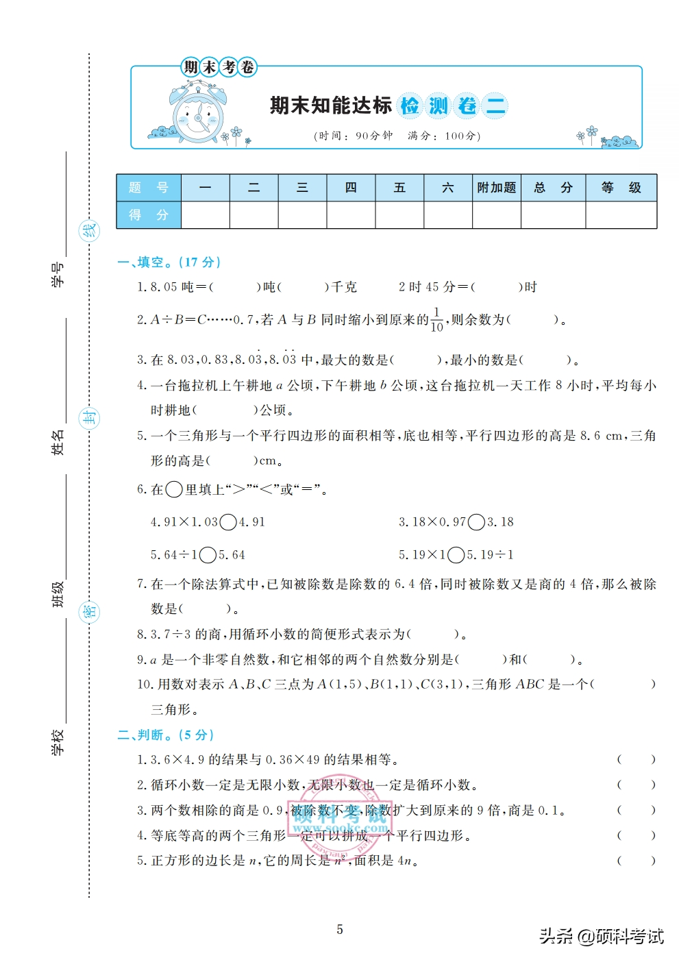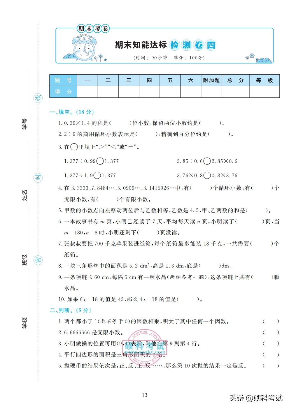 版权声明:我们致力于保护作者版权,注重分享,被刊用文章【四年级上册期末考试卷(五年级数学期末试卷)】因无法核实真实出处,未能及时与作者取得联系,或有版权异议的,请联系管理员,我们会立即处理! 部分文章是来自自研大数据AI进行生成,内容摘自(百度百科,百度知道,头条百科,中国民法典,刑法,牛津词典,新华词典,汉语词典,国家院校,科普平台)等数据,内容仅供学习参考,不准确地方联系删除处理!;