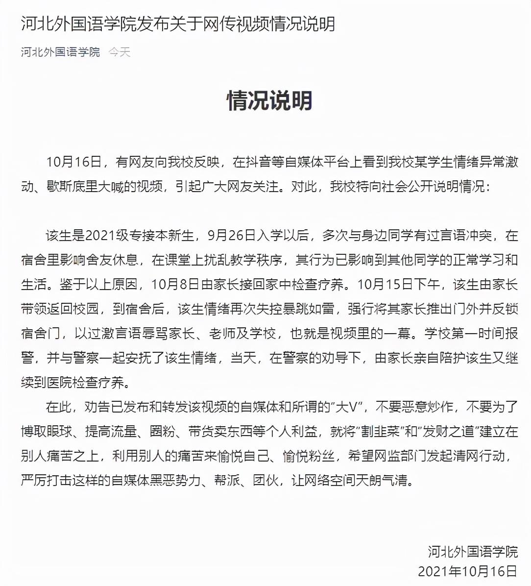 河北外国语学院是一所民办院校,民办院校的管理难免会存在疏忽。我认为这个女生可能是受到了什么刺激,才会有这么大的反应,同时也可以看得出来,她并不甘心在这所民办大学上学。她是一个非常有上进心的学生,认为民办学校的教学管理都比较差。所以才会有这种心理落差,情绪波动。