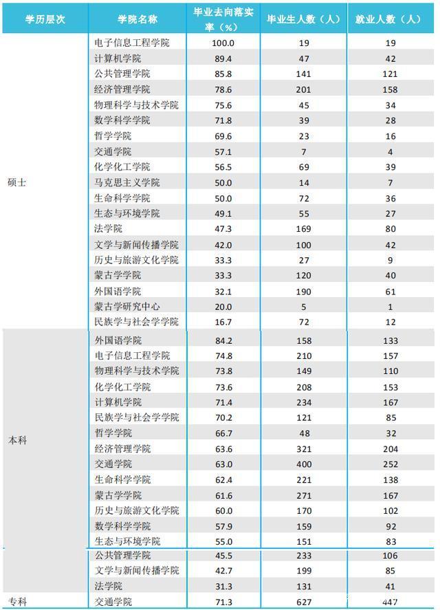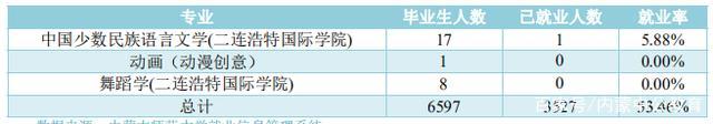 就业率在60%-70%的学院有6个,分别是美术学院、国际设计艺术学院、蒙古学学院、工艺美术学院、计算机科学技术学院、音乐学院。