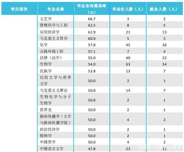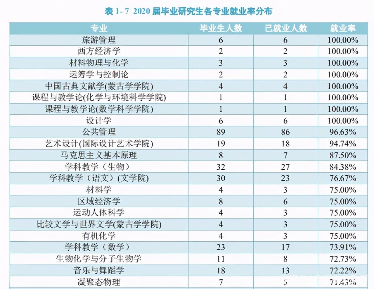 毕业研究生:学校 2020 届毕业研究生分布在 131 个专业,其中有8个专业实现了就业率100%。这8个专业分别是旅游管理、西方经济学、材料物理与化学、运筹学与控制论、中国古典文献学(蒙古学学院)、课程与教学论(化学与环境科学学院)、课程与教学论(数学科学学院)、设计学。
