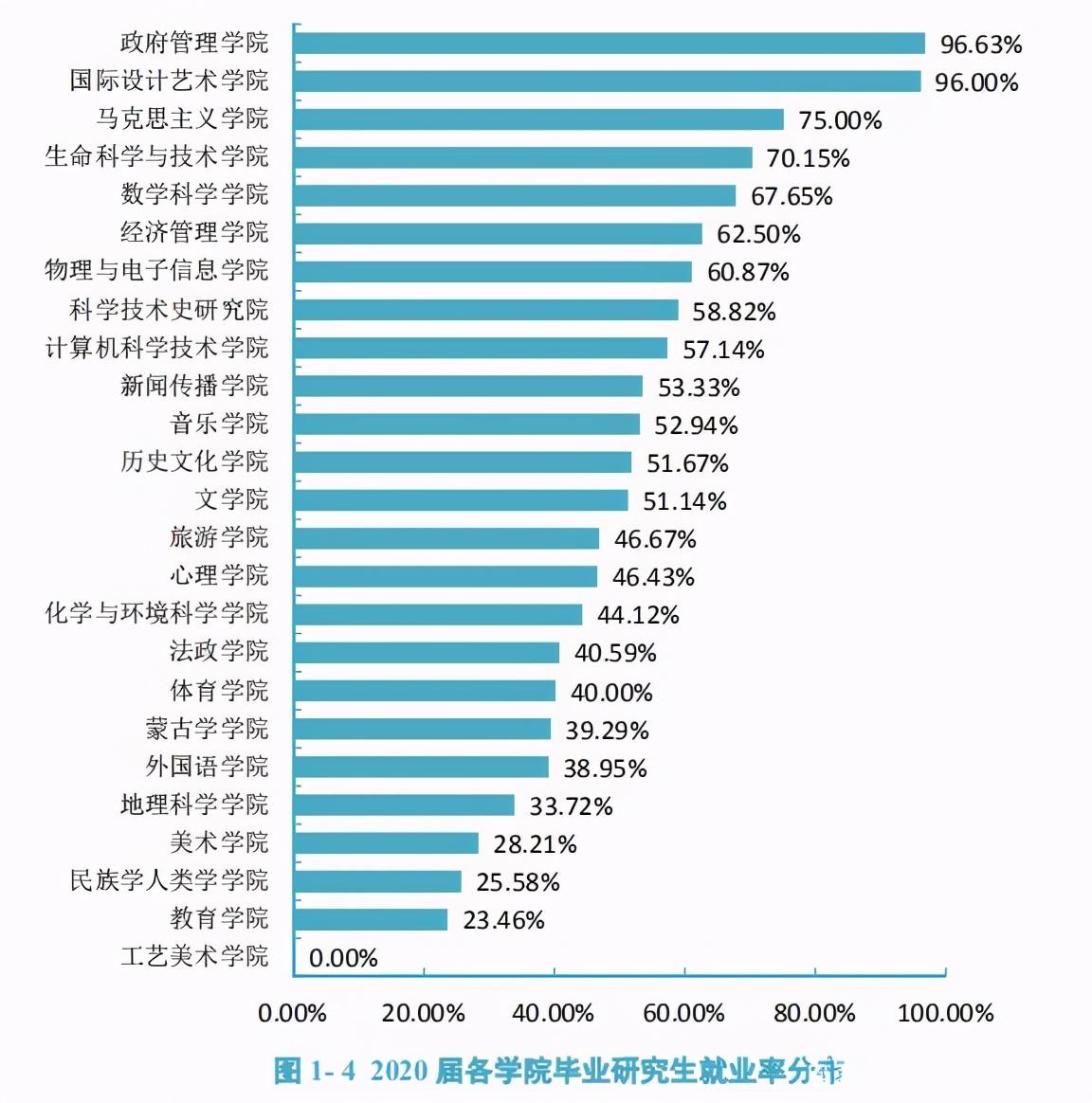 毕业研究生:学校 2020 届毕业研究生分布在 25 个学院,其中政府管理学院(96.63%)、国际设计艺术学院(96.00%)和马克思主义学院(75.00%)毕业研究生就业率位居前三。