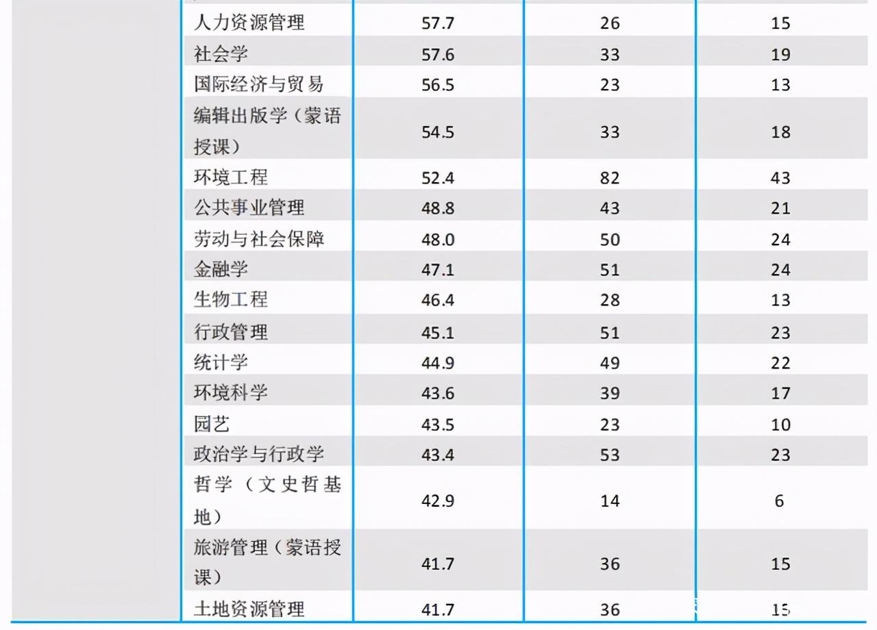 研究生:旅游管理、西方经济学、材料物理与化学、运筹学与控制论、中国古典文献学(蒙古学学院)、课程与教学论(化学与环境科学学院)、课程与教学论(数学科学学院)、设计学、工程力学、工程热物理、传播学、汉语言文字学、金融学、模式识别与智能系统、物理电子学、新闻学、信息与通信工程、中国古代文学、宗教学。