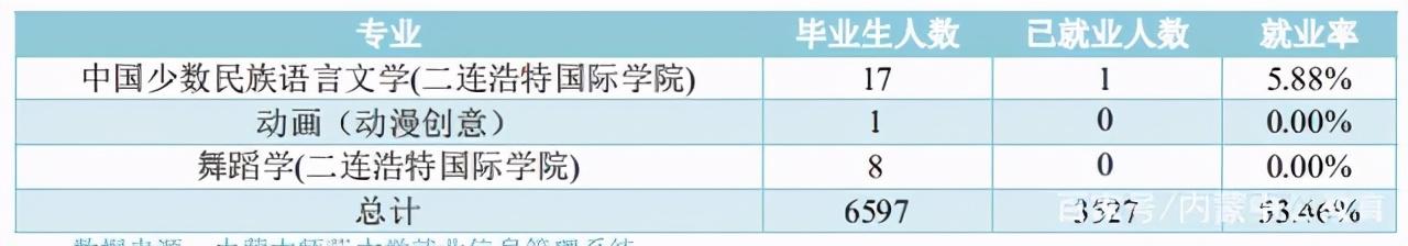 本科毕业生:学校 2020 届本科毕业生分布在 128 个专业,11个专业本科毕业生就业率达100%,他们分别是音乐表演(空中乘务)、作曲与作曲技术理论、环境设计(室内设计方向)、环境设计(室内设计)、绘画(民族绘画)、计算机科学与技术(嵌入式)、视觉传达设计(游戏设计)、视觉传达设计(广告策划与设计)、音乐表演(旅游学院)、音乐学(声乐)、汉语言文学(兴安职业技术学院)。