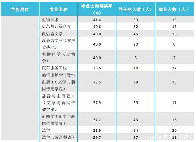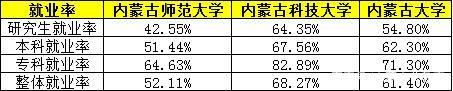 从2020年毕业生就业率报告来看,内蒙古科技大学总体的就业率高于内蒙古师范大学和内蒙古大学,就业率高达64.35%。从学历就业率来看,研究生、本科、专科的就业率内蒙古科技大学依然位居首位,其次是内蒙古大学,然后是内蒙古师范大学。