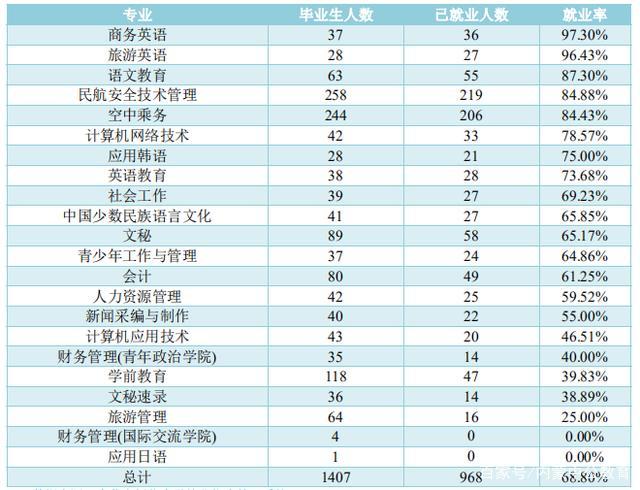 专科毕业生:学校 2020 届专科毕业生涉及 22 个专业,其中商务英语和旅游英语就业率超过90%。80%—90%的就业率有语文教育、民航安全技术管理和空中乘务专业。