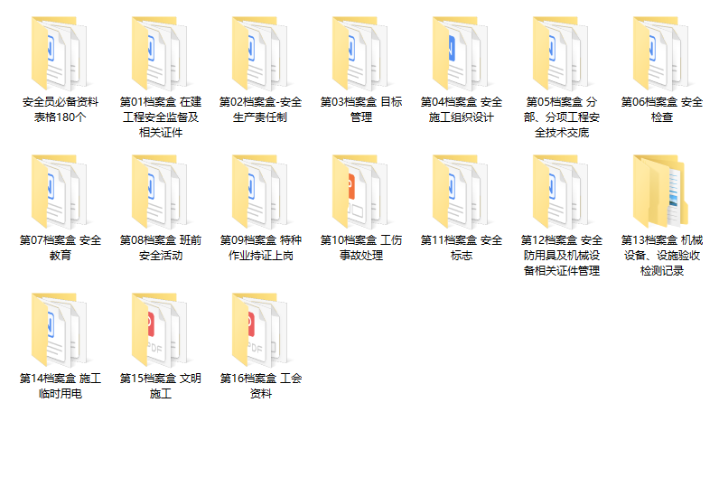 16盒安全员档案盒包含280个文件文档和180套Excel表格模板,从开工到竣工的所有安全相关资料都能在这里找到,真是久旱逢甘霖解救了我这个零基础小白。
