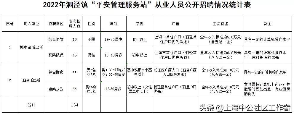 (4)具体条件和岗位要求及工资待遇详见泗泾镇《“平安管理服务站”从业人员公开招聘情况统计表》(附表一)。