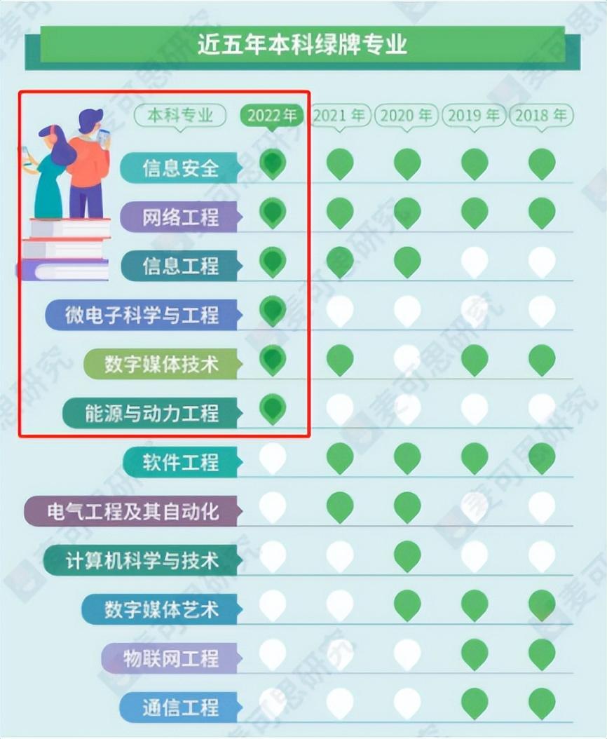 绿牌专业是指失业量较小,就业率、薪资和就业满意度综合较高的专业。近五年,共12个专业上榜绿牌专业,其中2022年本科就业绿牌专业为信息安全、网络工程、信息工程、微电子科学与工程、数字媒体技术、能源与动力工程。在今年的本科就业绿牌专业中,能源与动力工程专业为中国石油大学(华东)2022年本科招生专业。