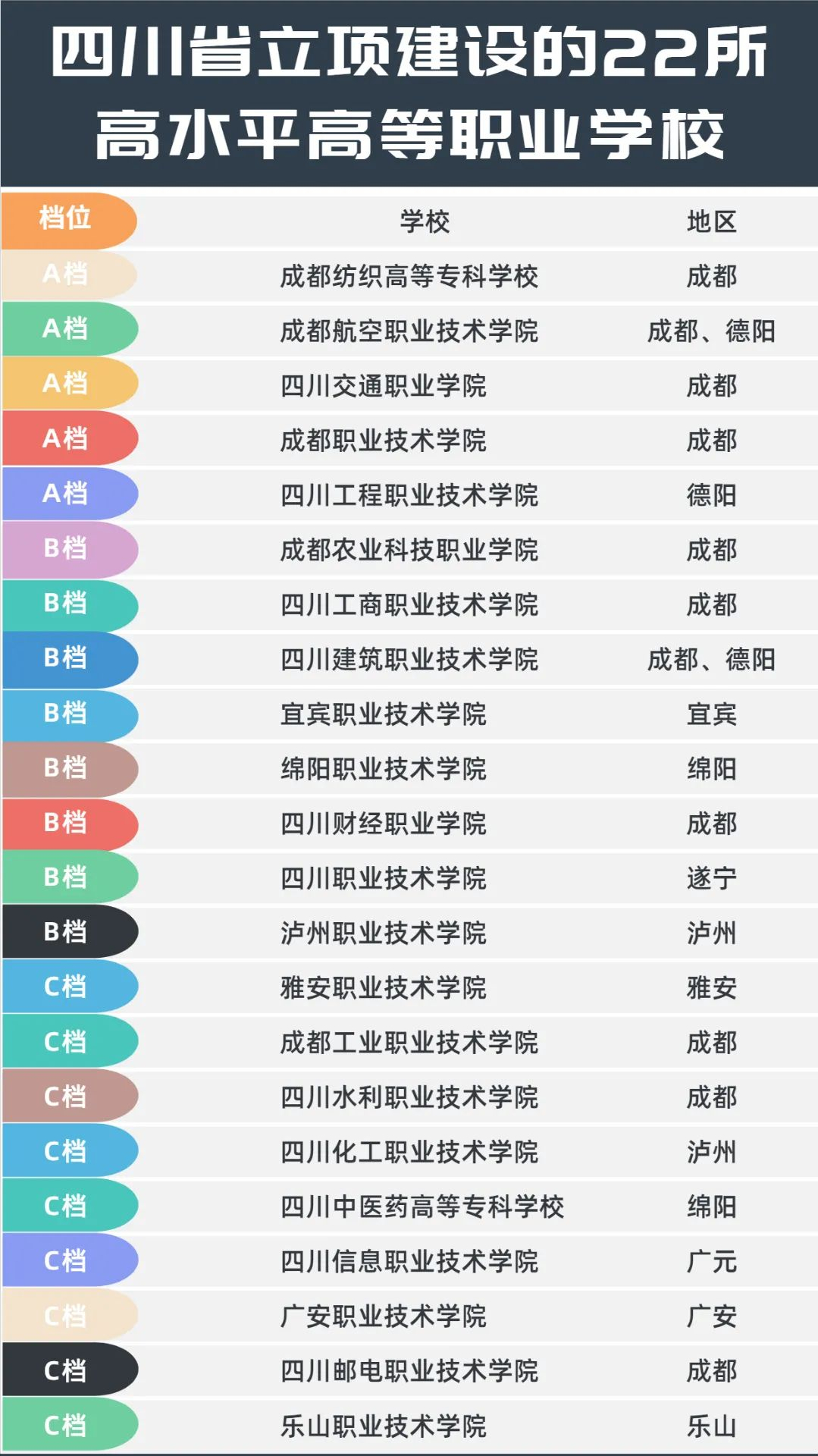 2022年公布了四川省立项建设的22所高水平高等职业学校(含8所“国家双高”建设学校),50个高水平专业群,15所高水平高等职业培育学校并进入编制项目建设任务书环节。