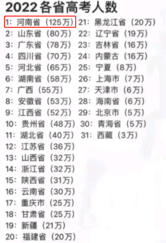 河南向来以高考人数多、排名靠前的学校少而驰名,甚至省内一所985都没有。难怪河南学生经常自嘲自己的高考难度,是“地狱级别”的。其他省份的高考生能达到600分就算是学霸了,但是河南600分的考生比比皆是,可能连热门专业都去不了。